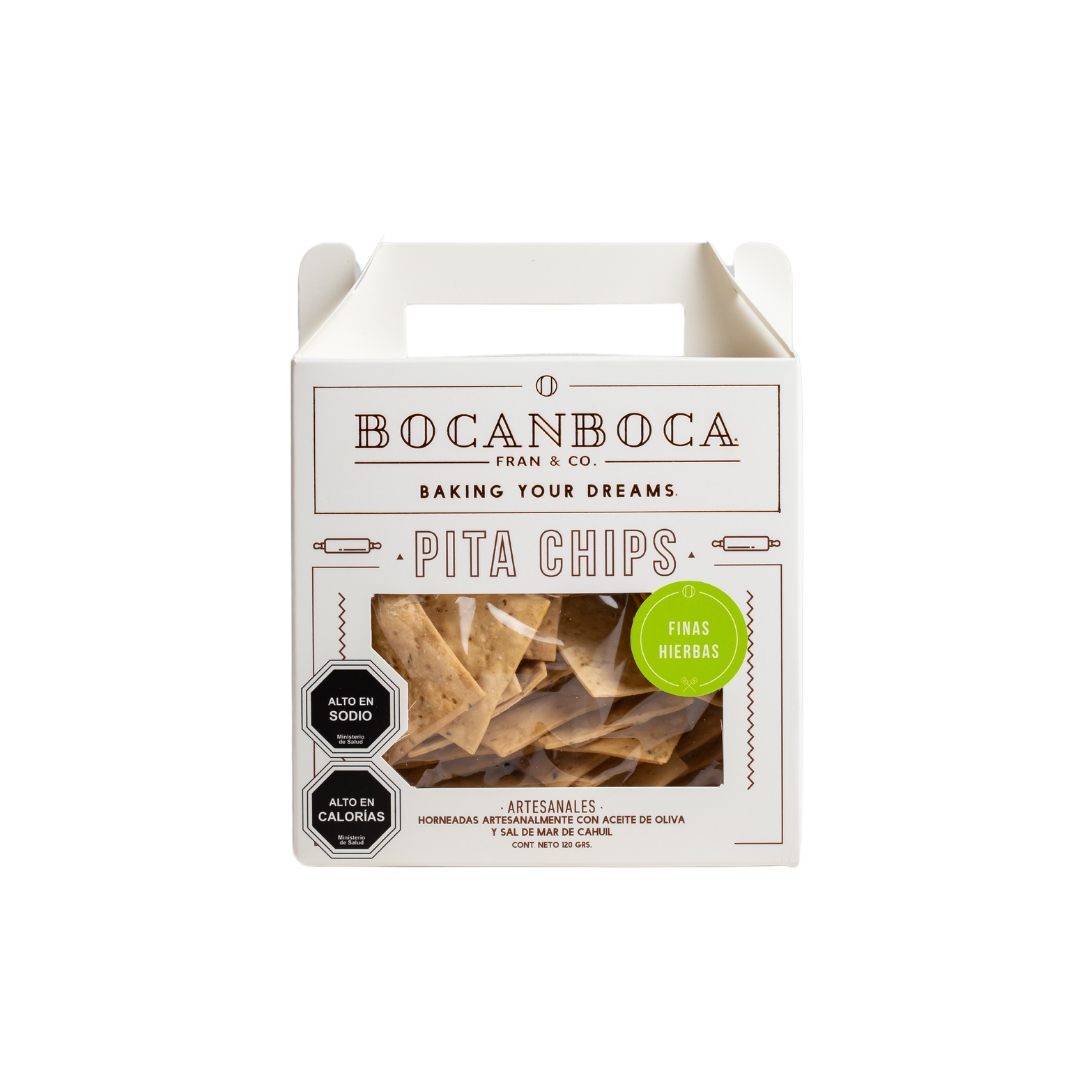 Deliciosas pita chips de finas hierbas horneadas y elaboradas artesanalmente. Perfectas para acompañar nuestros dips y pastas rústicas Suk.
