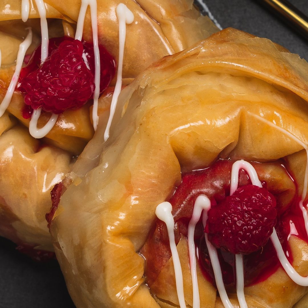 Rollo de masa filo relleno de mermelada de frambuesas, cubierto con chocolate blanco y un toque de almíbar. Ideal para el postre, celebraciones, cumpleaños y más.