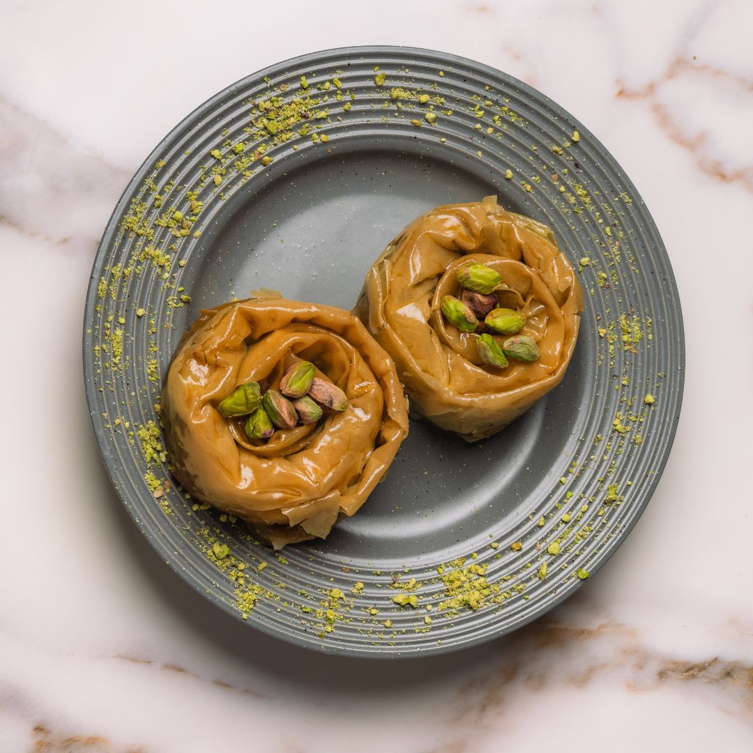 Rollo de masa filo relleno de pistachos con un toque de almíbar. Ideal para el postre, celebraciones, cumpleaños y más.
