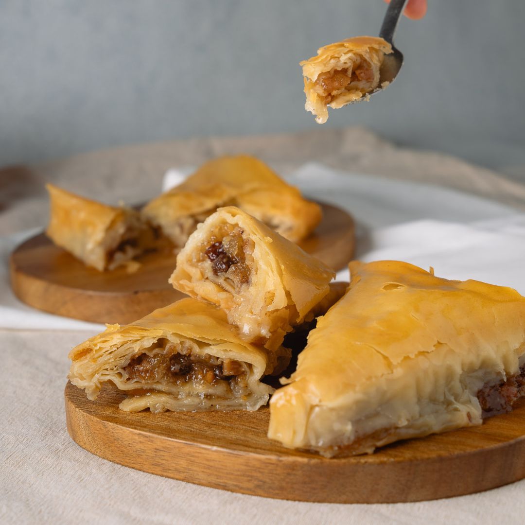 Triángulo de masa filo relleno de manzanas y canela, con un toque de almíbar. Ideal para el postre, celebraciones, cumpleaños y más.