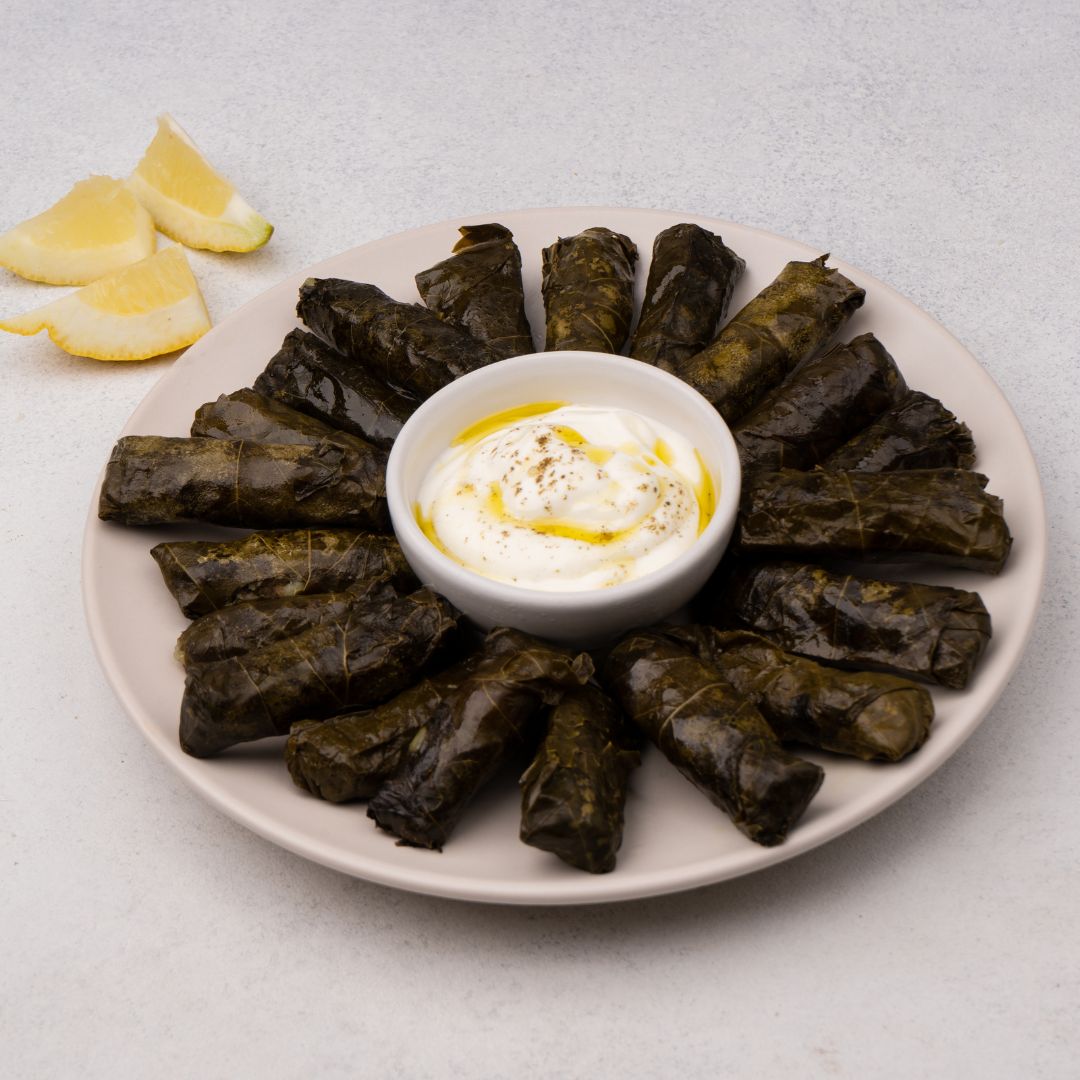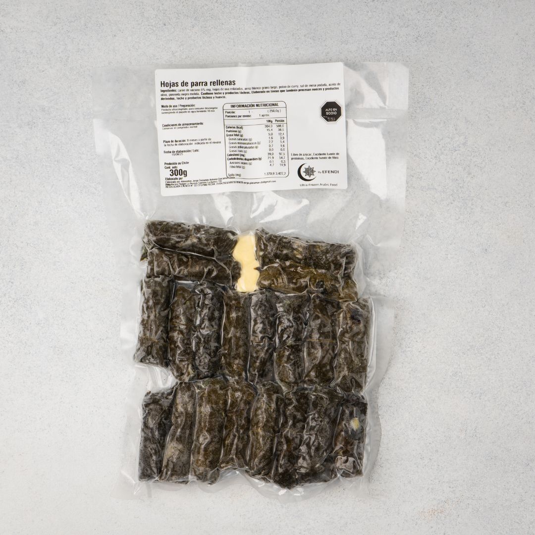 Hojas de parra rellenas con arroz, carne vacuno 7% mg, curry, aceite de oliva, pimienta negra molida. Contiene leche y producto lácteos.