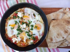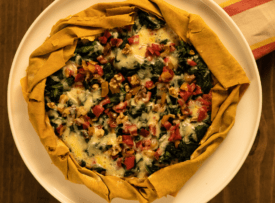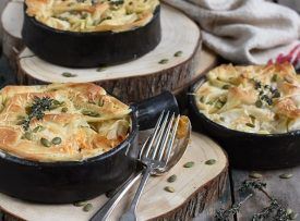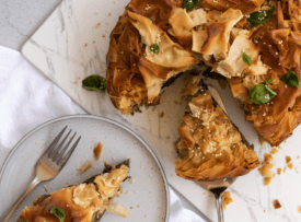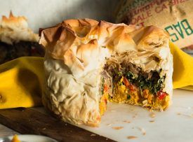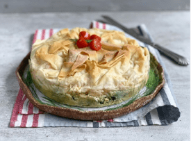 Tarta de masa filo rellena con verduras asadas, queso feta y hierbas