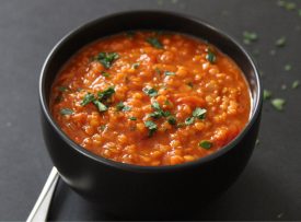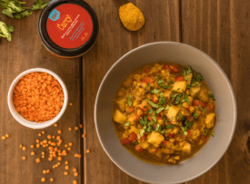 Pie de lentejas rojas con leche de coco y crocante cubierta