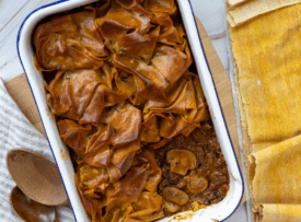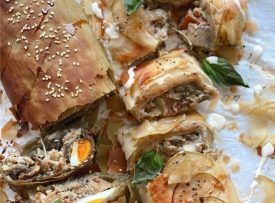 Pastel de carne a la olla y masa filo de cúrcuma Suk