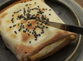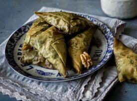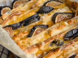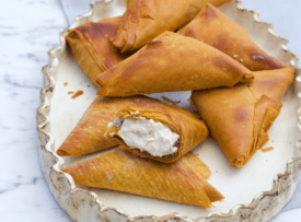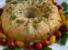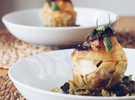 Queso camembert, arándanos y pistachos, envuelto en masa filo Suk