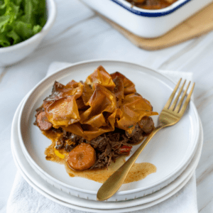 Pastel de carne a la olla y masa filo de cúrcuma Suk