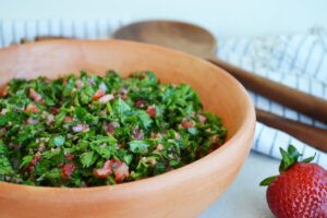 Remojar las 2 cdas de burgol en agua caliente por 10 minutos y luego escurrir hasta quitar todo el exceso de agua. En un bol, agregar el perejil y hierbabuena picados muy fino, la cebolla y frutillas picadas en cubos pequeños, incorporar el burgol, jugo de naranja y limón, aceite de oliva, sal y pimienta y mezclar muy bien.